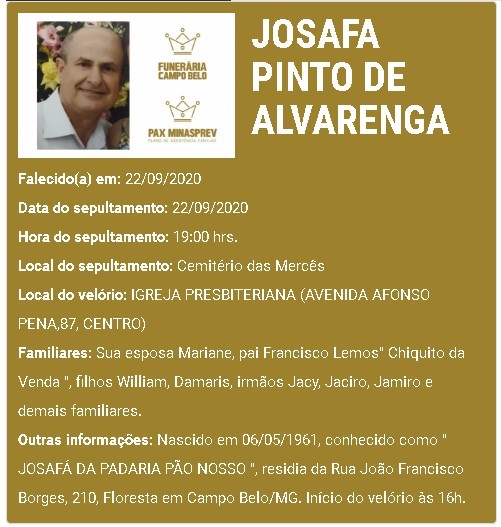 Na manhã desta terça-feira, dia 22 de Setembro, aconteceu um grave acidente na BR-354, próximo a cidade de Campo Belo que vitimou o campobelense Josafa Pinto de Alvarenga, de 59 anos.