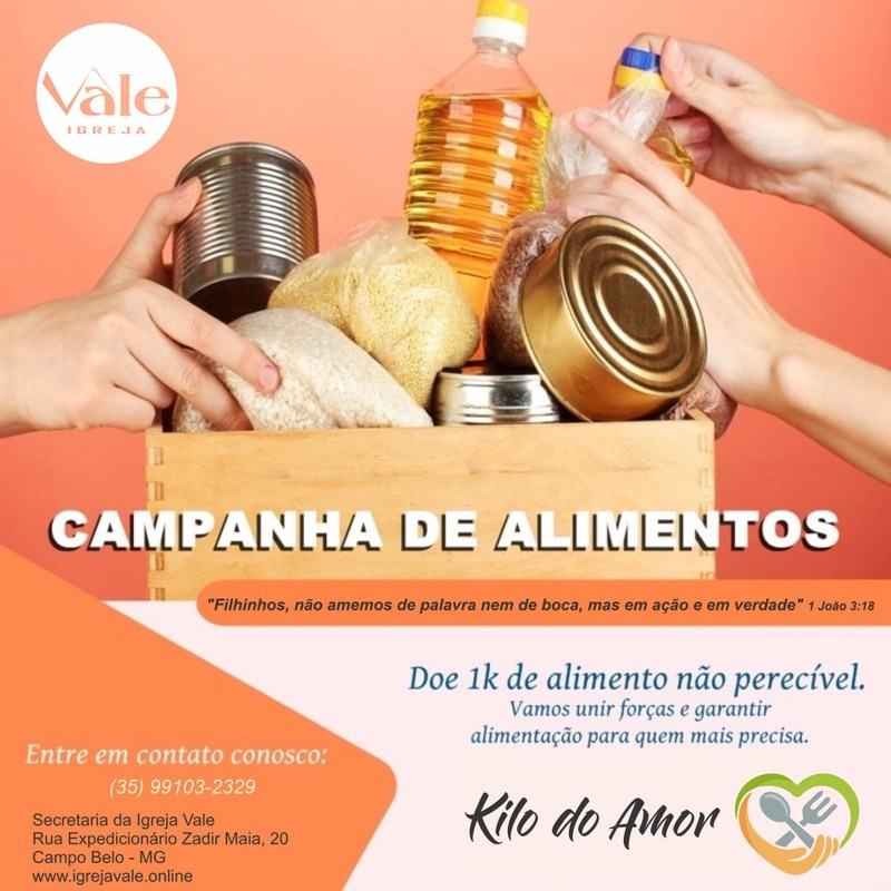 A igreja Vale das Bênçãos de Campo Belo, pastoreada pelo Pastor Daniel Martins, está com uma campanha de arrecadação de alimentos para assistir aos necessitados.