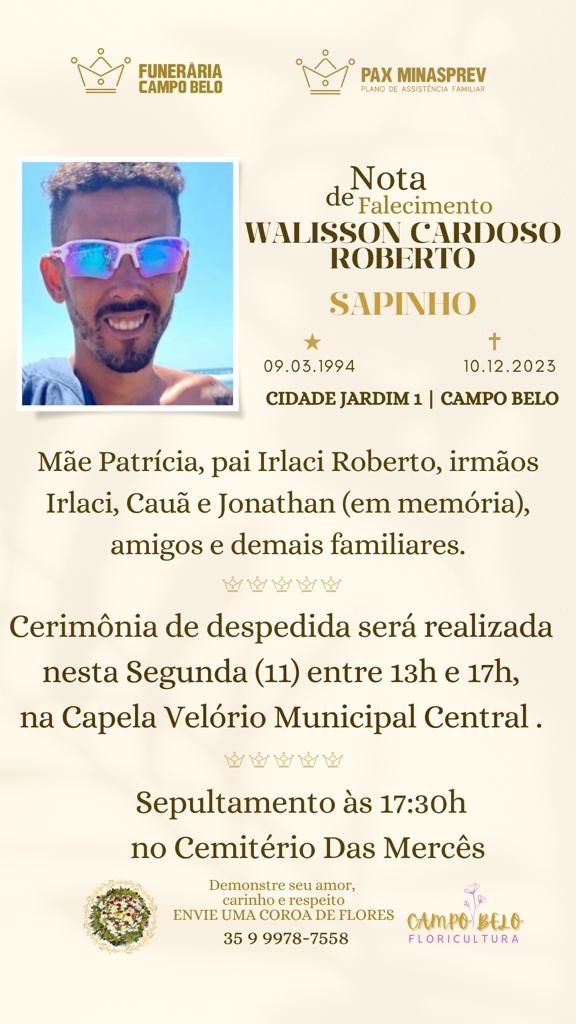 O Walisson Cardoso Roberto, conhecido como Sapinho, de 29 anos, foi atingido por diversos disparos de arma de fogo na noite deste domingo, 10 de dezembro de 2023, no bairro Vila São Jorge, em Campo Belo.