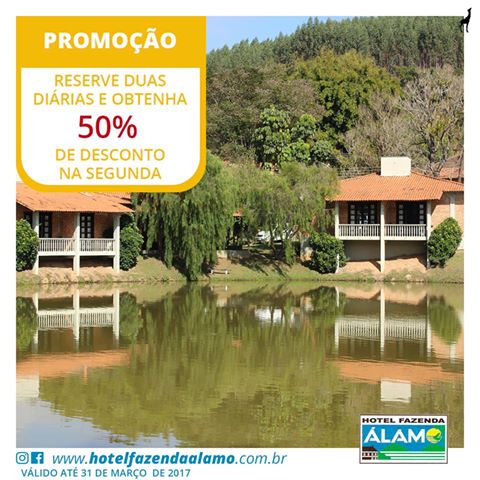 O Hotel Fazenda Alamo está com uma super promoção, na reserva de duas diárias você ganha 50% de desconto na segunda.